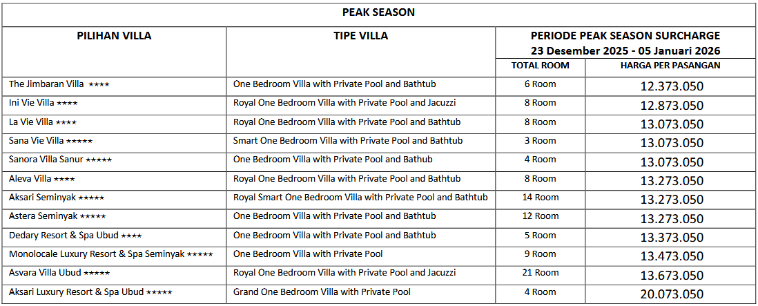 HARGA PER PASANGAN PEAK SEASON ( 2 Peserta )